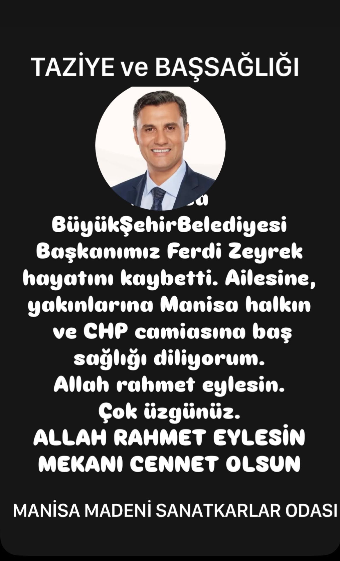 Manisa Büyükşehir Belediye Başkanı Ferdi ZEYREK’i kaybettik. Manisa halkının Başı Sağ olsun.