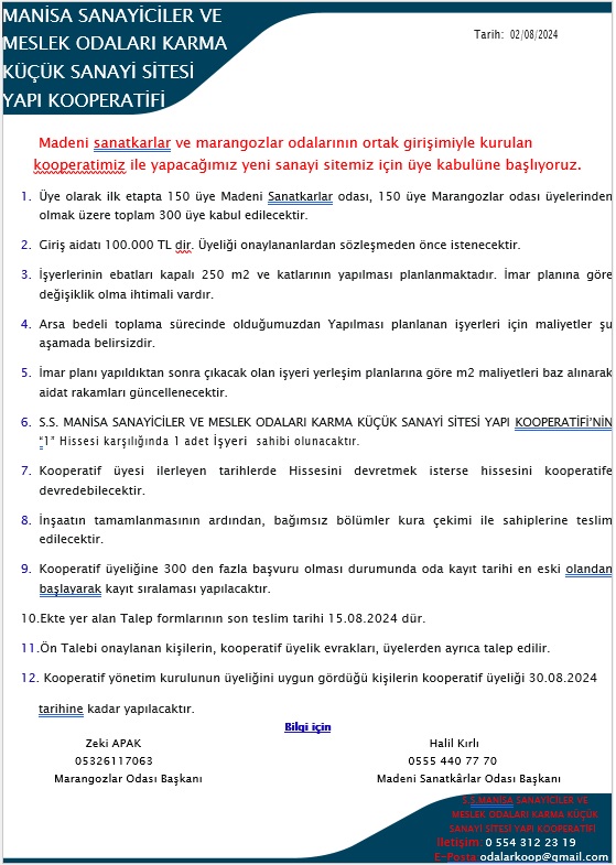 S.S. MANİSA SANAYİCİLER MESLEK ODALARI KARMA KÜÇÜK SANAYİ YAPI KOOPERATİFİ BAŞVURULARI BAŞLAMIŞTIR.